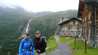 The trail led down the valley over slick tree roots and rocks. For Alison and Katie, it was like hiking at home in Oregon. We crossed several mountain streams sometimes with the aid of a bridge and sometimes not. Katie’s long legs had little trouble stepping along stones to cross the streams, but Linnea's short legs were another matter. She never waivered and made it across without help each time, but I don’t think there are many streams to be forded in LA! It was a short climb from the valley bottom to the small hamlet of Gimmelwald. We arrived at a pleasant hostel serving food on their sunny terrace – yes, sunny! We plopped down, dropped the packs and ordered tea, soup and apple strudel. We heard that the residents sold local cheese and milk from their homes so we went on a search only to find that they were out of the house making hay and wouldn’t be home until dinner. Oh well. But our search took us past quaint homes with gardens brimming with lettuce, beets, onions, kale and rhubarb. Bright flowers spilled over every window sill and balcony. Gnomes of all sizes were in each yard, and goats were climbing on the barns. …..it was so Swiss.